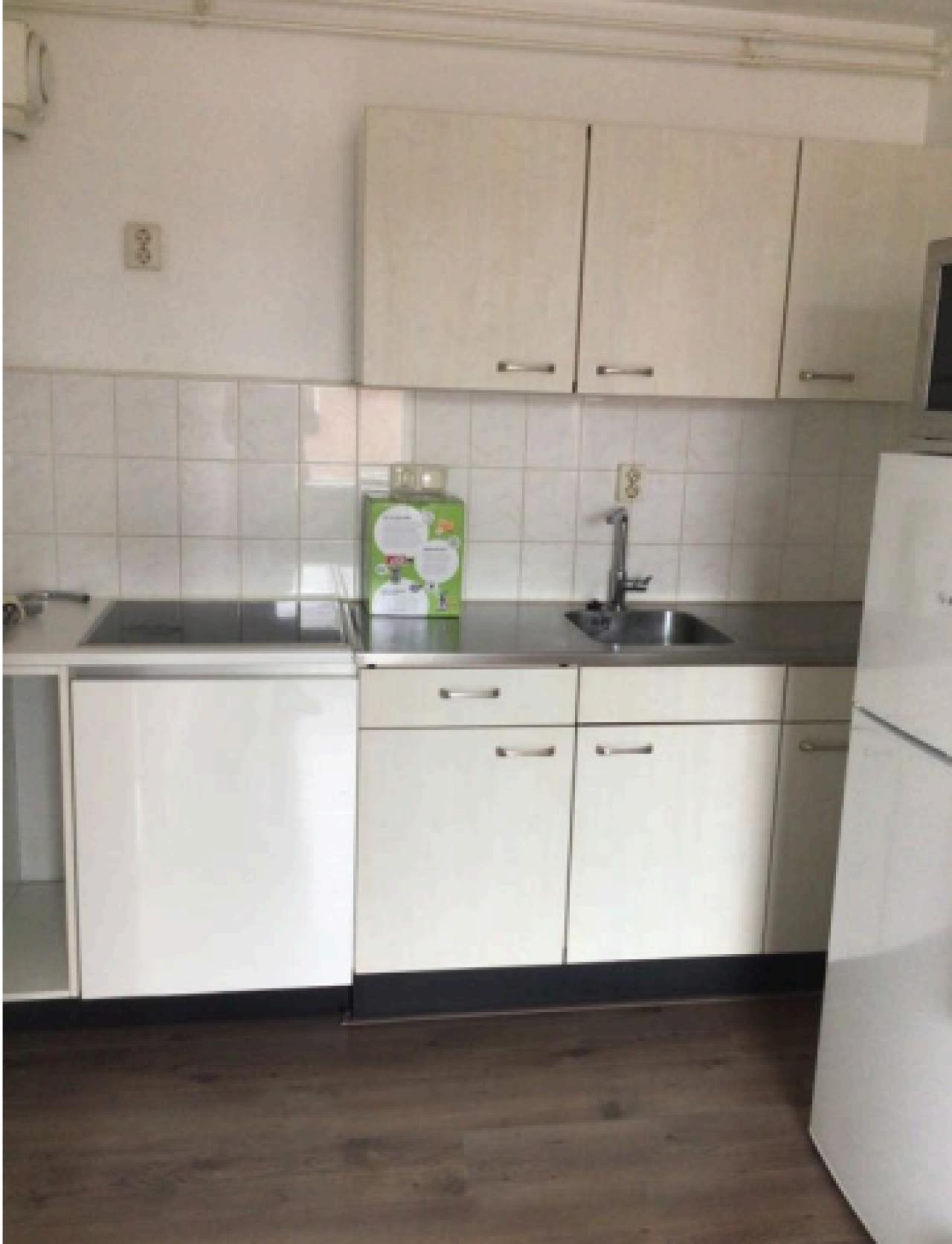 * Woonkamer met open keuken (de groene wand op de foto wordt overschilderd door vertrekkende huurder)
