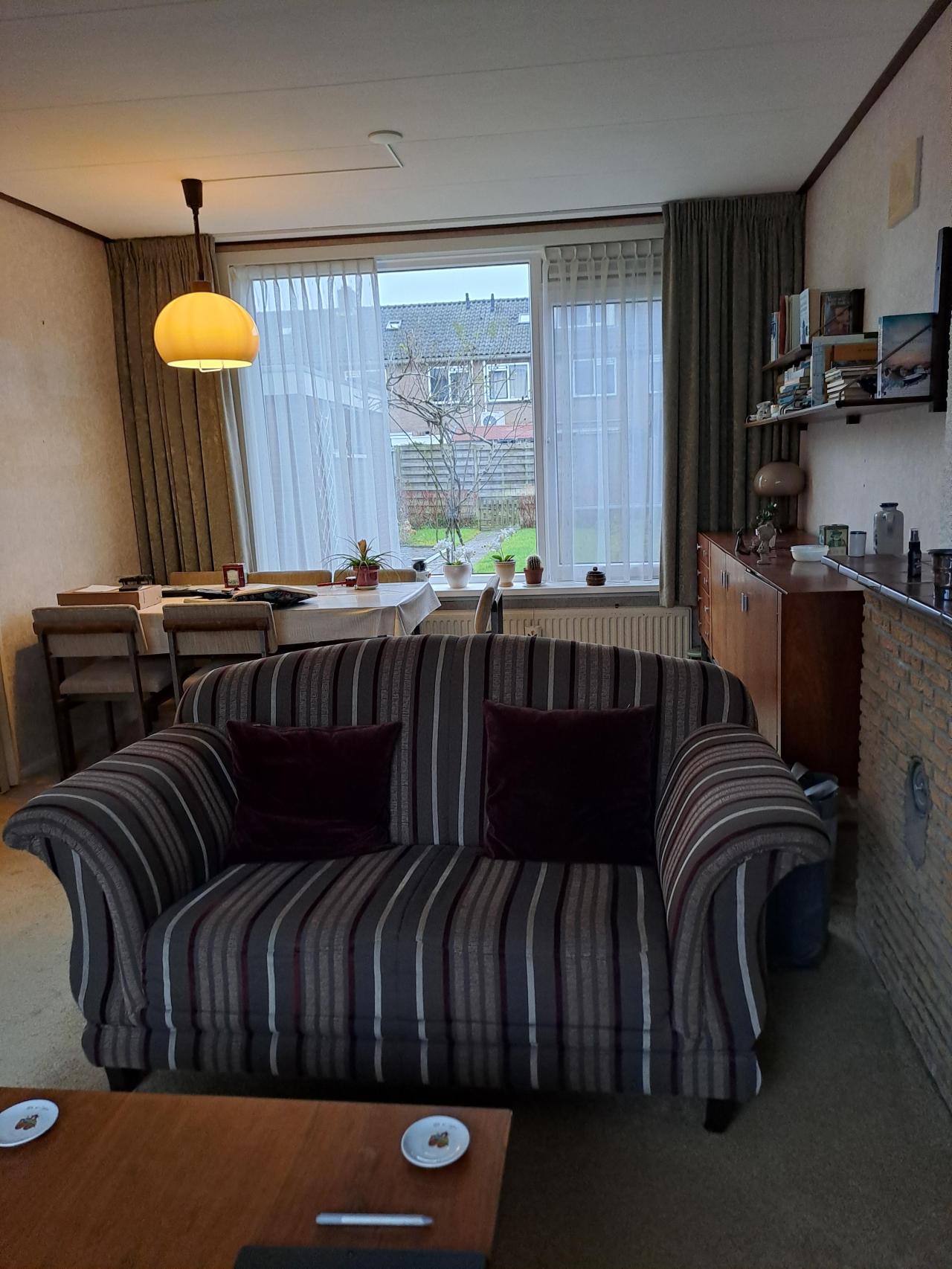 Vier kamer tussenwoning met een ruime achtertuin op het Zuiden. Vanuit de hal komt u in de woonkamer. Het is een open keuken. Op de 1e verdieping 3 slaapkamers en kleine badkamer. Er is geen tweede toilet. Vaste trap naar zolder. Houten vloeren. Het dak wordt geïsoleerd. Er worden 4 zonnepanelen geplaatst en een hybride warmtepomp. Daarna wordt de woning opgeleverd aan de nieuwe huurder.